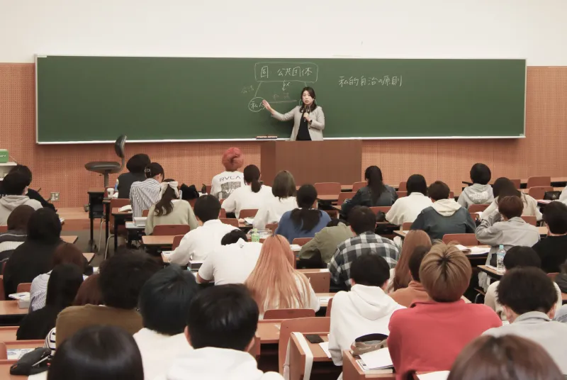 法学部では、1年次から4年次までゼミ(演習科目)が必修です。特に、1年次においては、少人数のクラス編成で「教養教育ゼミ」が開講されています。「教養教育ゼミA」では、「大学とはどんなところか」「ノートの取り方・レポートの書き方」「法律の勉強の仕方」等、大学入門・法律入門的な授業を行います。「教養教育ゼミB」では、キャリア教育をおこない、将来を見据えて法学を学ぶ意義を考えていきます。教員と学生が双方向の授業を行う中で、新入生の勉学のサポートを行っています。